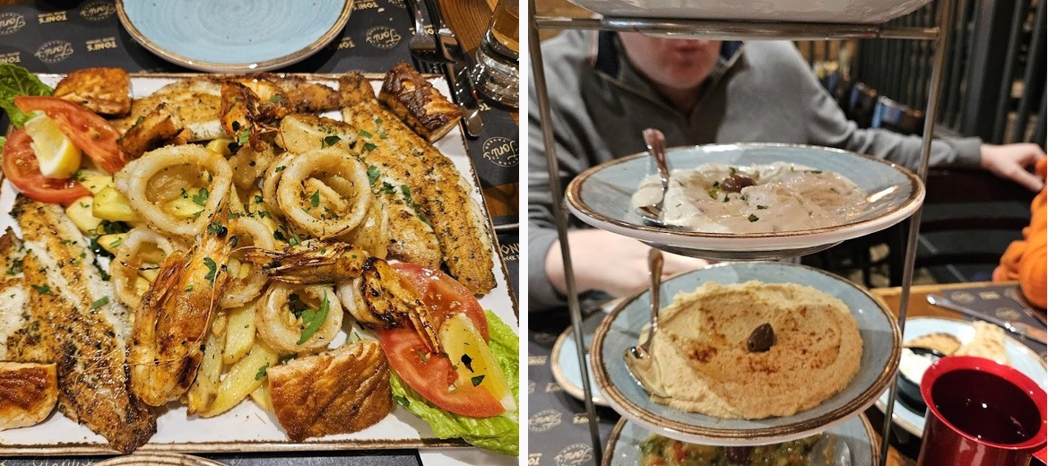 We had a lovely meal (shared the seafood platter between 2). Lots of delicious bread and fresh dips as well as beautifully cooked fish. Children were also well catered for. The house wine was lovely and reasonably priced. Staff were attentive and place has a nice atmosphere . The menu had lots of choice suitable for a light meal or a big dinner. Would definitely recommend visiting if you're local